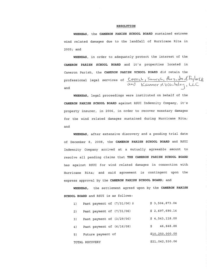 On the motion of Mr. Nunez, seconded by Mrs. Trahan, the Board approved a resolution to adopt settlement of property damage claims related to Hurricane Rita. (Attachment)