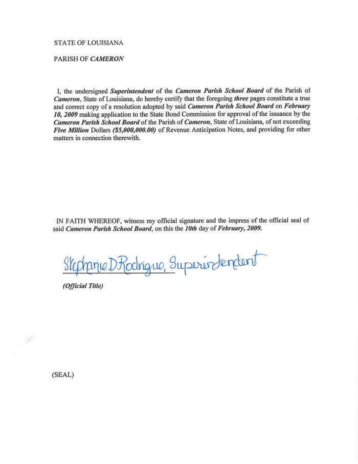 On the motion of Mrs. Nunez, seconded by Mrs. Theriot, the Board approved the resolution making application to the State Bond Commission for approval of the issuance by Cameron Parish School Board of the Parish of Cameron, State of Louisiana, of not exceeding Five Million Dollars ($5,000,000.00) of Revenue Anticipation Notes, and providing for other matters in connection with the Community Disaster Loan as presented by the Superintendent.