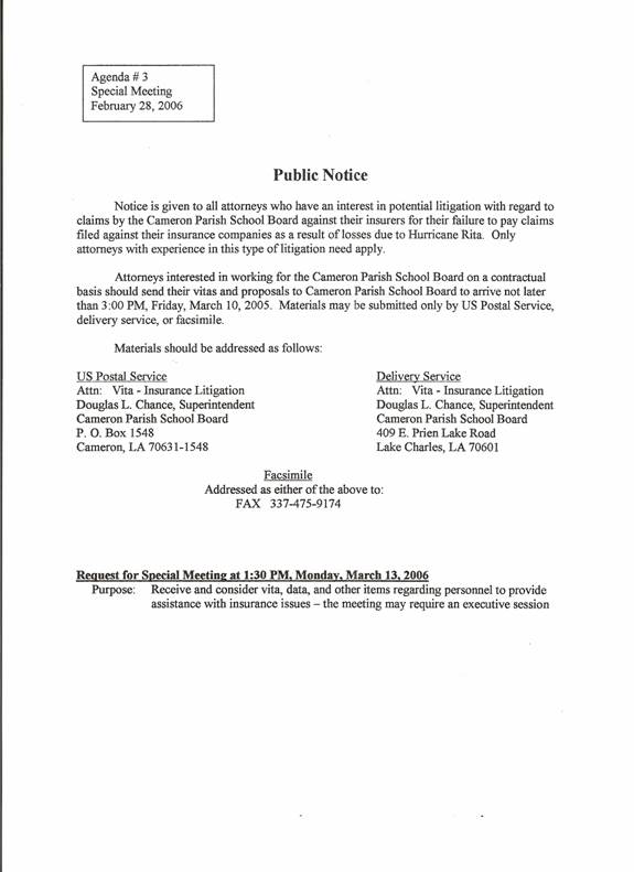 On motion of Mr. Howerton, seconded by Mr. Sanner, the Board received a report from Mr. M.B. Slocum regarding insurance, and a report from the superintendent regarding advertising for and receiving vita from attorneys with expertise in insurance claims. (copy of notice attached)