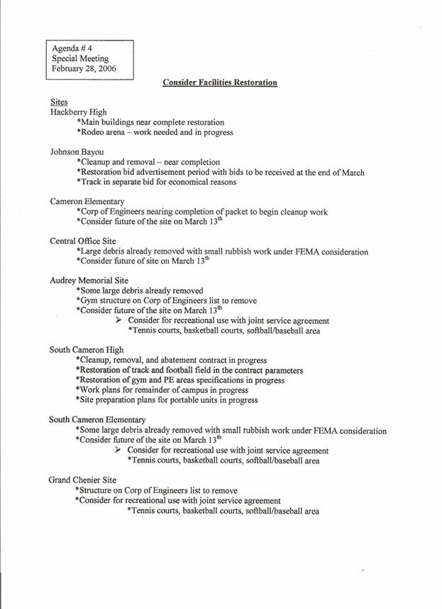 On motion of Ms. Abadie, seconded by Mrs. Theriot, the Board received a report from the superintendent on restoration of facilities with action to be addressed in the regular meeting on March 13, 2006. (copy attached)
