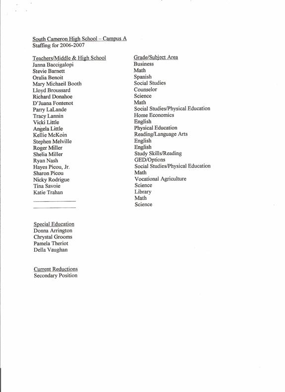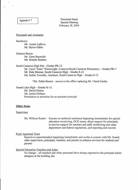 On motion of Mr. Sanner, seconded by Mrs. Theriot, the Board approved to advise items for the 2006 – 2007 instructional programs and extra-curriula program which included calendar, instructional day, technology, and restoration of destroyed items and program needs directly impacting students at Hackberry, Johnson Bayou, South Cameron and Grand Lake.