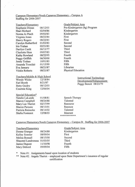 On motion of Mrs. Theriot, seconded by Mrs. Abadie, the Board approved personnel items for the 2006 – 2007 school session and the following personnel report. (copy attached)