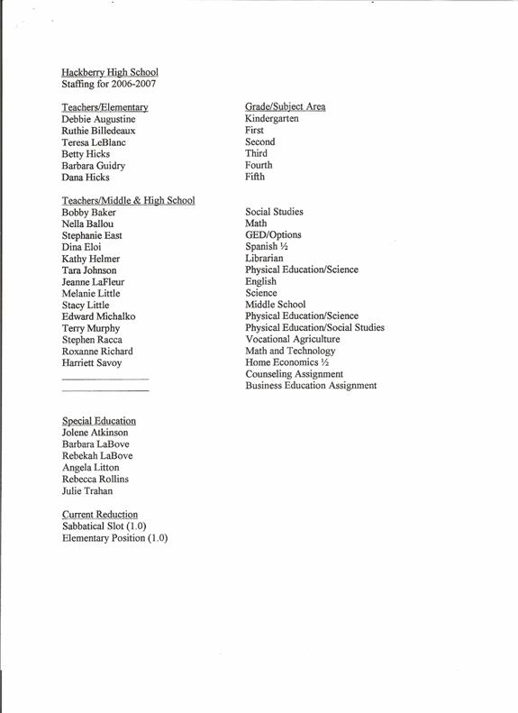 Ms. Brandy Jinks Food Service Tech, Johnson Bayou High School, effective at the close of the day February 17, 2006 through June 2, 2006 with plans to return upon the school’s relocation to Johnson Bayou School.
