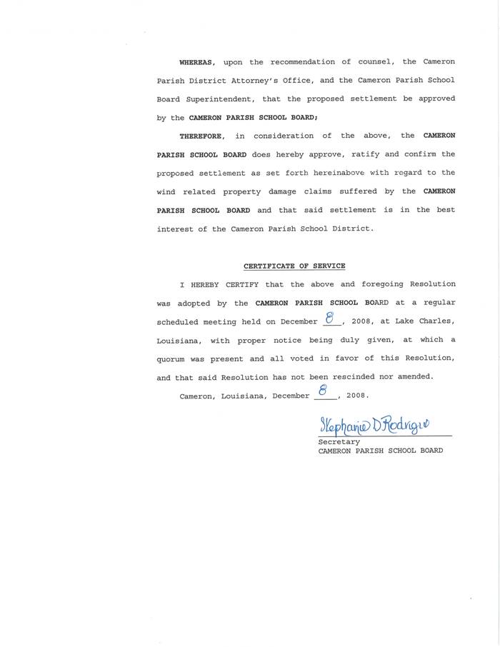 On the motion of Mr. Nunez, seconded by Mrs. Trahan, the Board approved a resolution to adopt settlement of property damage claims related to Hurricane Rita. (Attachment)