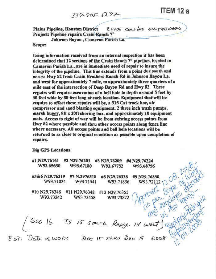 On the motion of Mr. McEvers, seconded by Mr. Nunez, the Board granted permission to lessor Plains Pipeline, Houston District, at 16:15.14, Crain Ranch 7", pipeline, Johnson Bayou, to move forward with immediate repairs to assure the integrity of the pipeline with estimated dates of work as December 15-19, 2008 as presented by Superintendent and District Attorney Cecil Sanner.