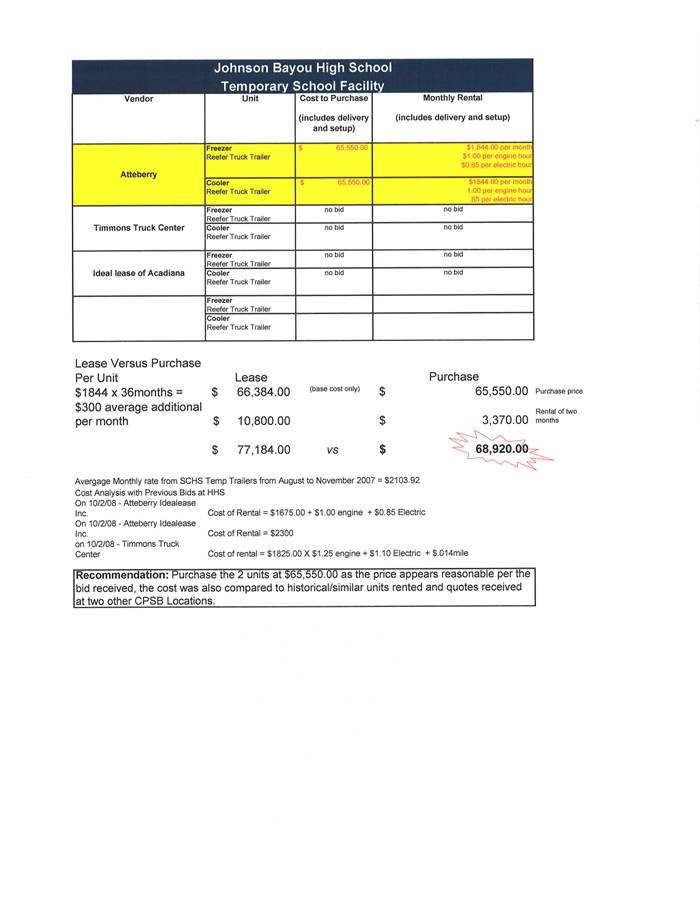 On the motion of Mrs. Theriot, seconded by Mrs. Trahan, the Board approved to accept low bids on the following currently advertised projects due to requisite number of advertising days and a need to move forward on these projects: 1) Hackberry High School contractor for storm-related repairs, Phase 1, with a two week extension to capture additional mechanical issues; 2) Hackberry High School, Johnson Bayou High School and South Cameron High School furniture and equipment to replace items lost to Hurricane Ike; 2) Johnson Bayou High School and South Cameron High School temporary facilities Security Systems; 3) Maintenance trucks and Maintenance/Delivery Cargo Panel Truck, as presented by the Superintendent.