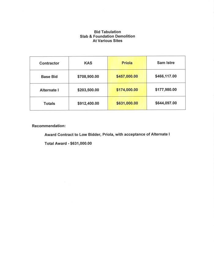 On the motion of Mrs. Nunez, seconded by Mrs. Theriot, the Board accepted the low bids on 1) Slab Removal of various Cameron Parish School Board sites with Alternate 1 - Priola Construction was the successful low bidder; 2) Johnson Bayou High School Cooler and Freezer refrigerated trucks - Atterberry Ideal Lease was the successful low bidder as presented by Selena Cisneros, Engineer. (See Attachment)