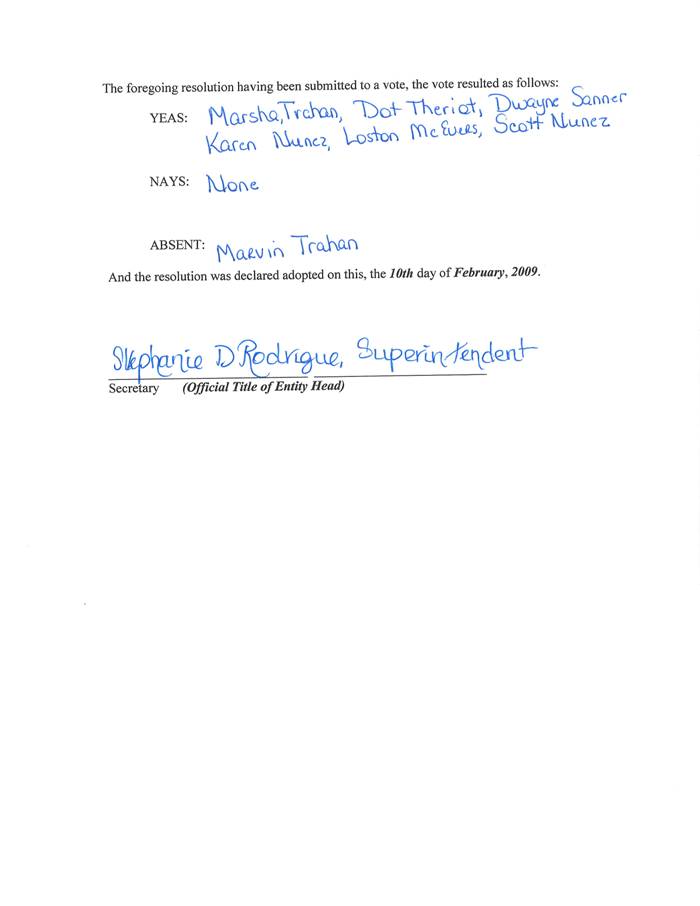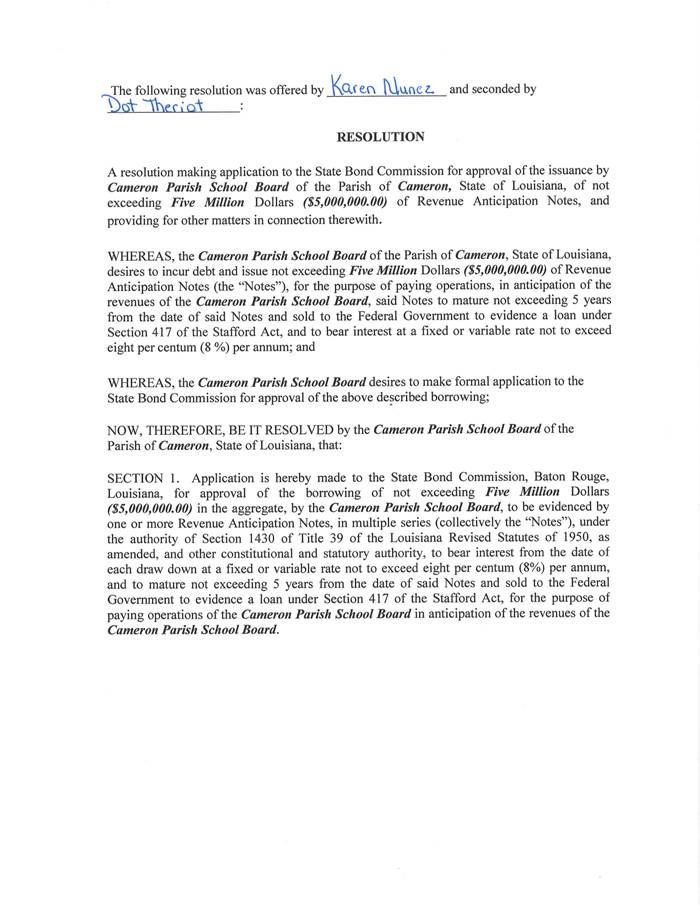 On the motion of Mrs. Nunez, seconded by Mrs. Theriot, the Board approved the resolution making application to the State Bond Commission for approval of the issuance by Cameron Parish School Board of the Parish of Cameron, State of Louisiana, of not exceeding Five Million Dollars ($5,000,000.00) of Revenue Anticipation Notes, and providing for other matters in connection with the Community Disaster Loan as presented by the Superintendent.