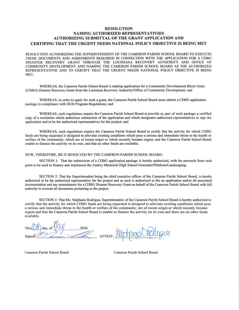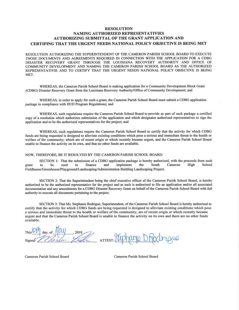 On the motion of Mrs. Theriot, seconded by Mr. Nunez, the Board authorized approval of the Community Development Block Grant resolutions naming Superintendent of Schools as authorized representative for the purpose of submitting the grants and certifying that the urgent needs national policy objective is being met, per CDBG guidelines, as presented by Ms. Selena Cisneros.