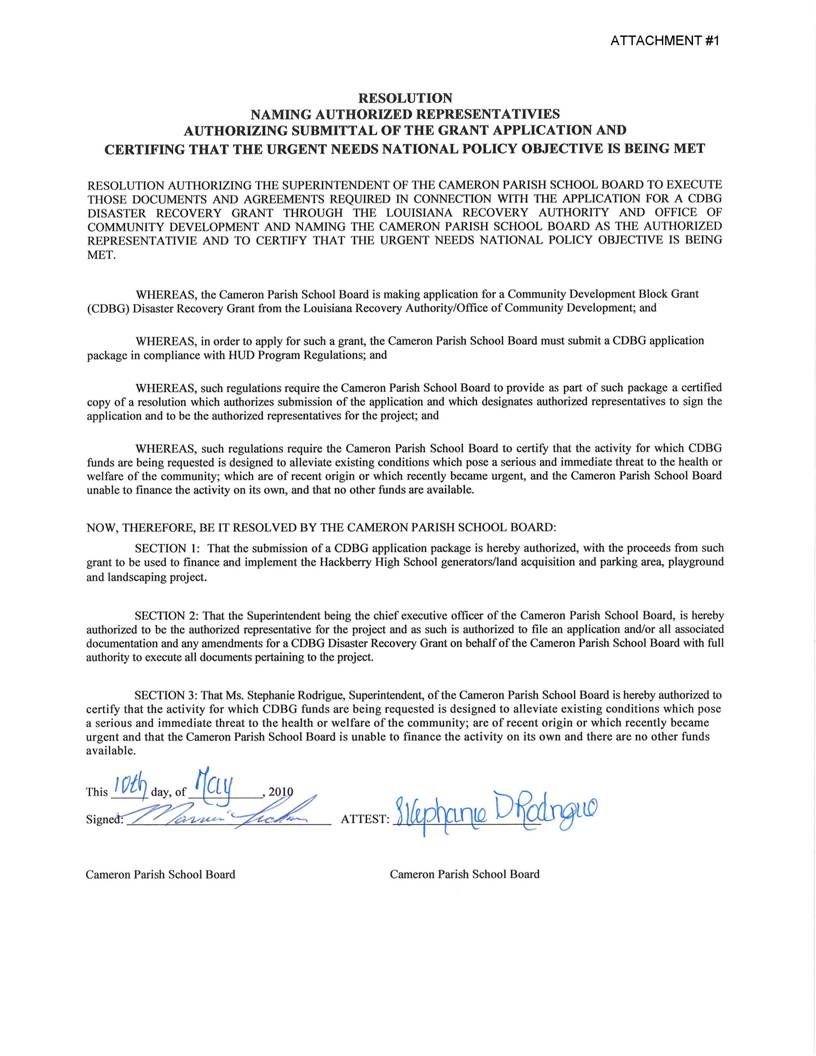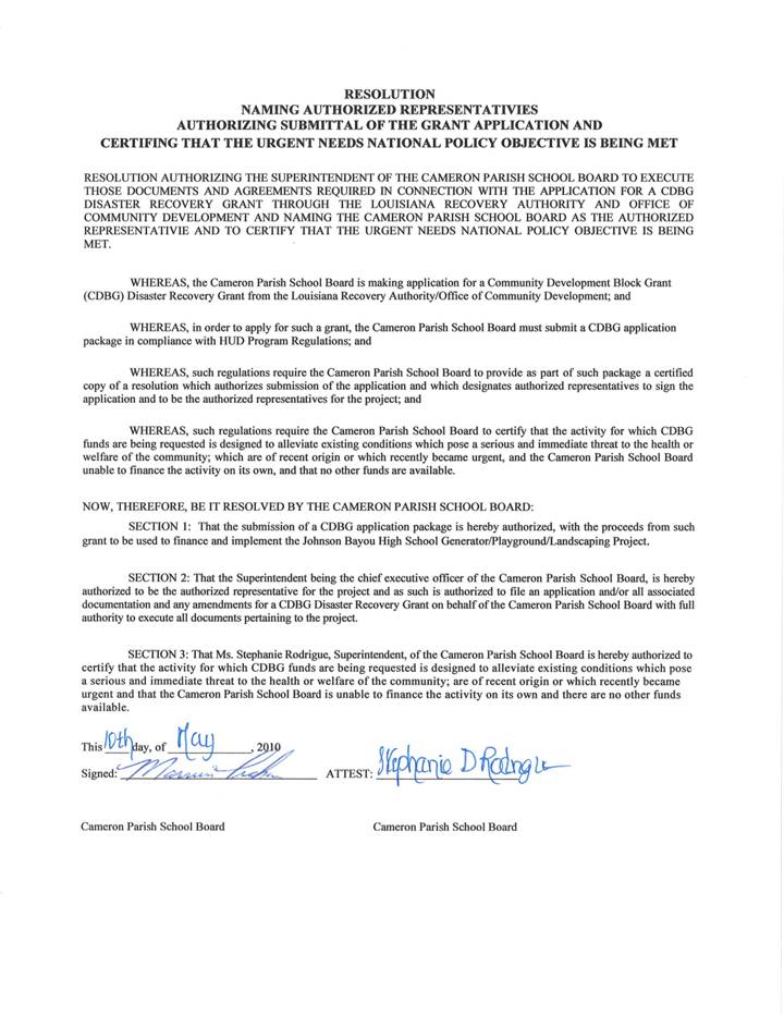 On the motion of Mrs. Theriot, seconded by Mr. Nunez, the Board authorized approval of the Community Development Block Grant resolutions naming Superintendent of Schools as authorized representative for the purpose of submitting the grants and certifying that the urgent needs national policy objective is being met, per CDBG guidelines, as presented by Ms. Selena Cisneros.