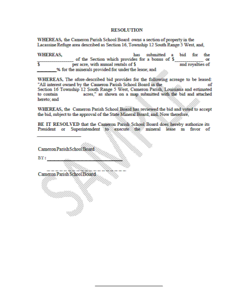 On the motion of Mr. Sanner, seconded by Mr. Boudreaux, the Board approved the following resolution regarding the mineral lease bid on Section 16-T12S-R5W- Lacassine Refuge, as presented by Mr. Lee Bloch, Bloch, Briggs and Associates, with resolution to be completed by Mr. Bloch with appropriate information and signatures.