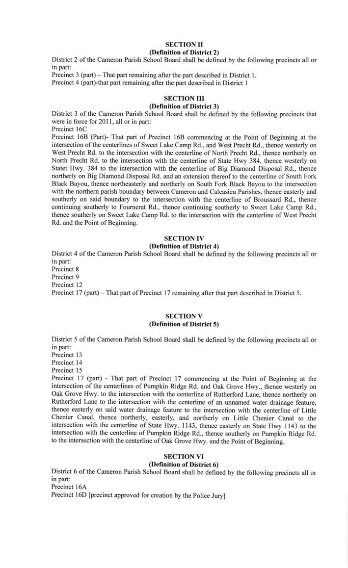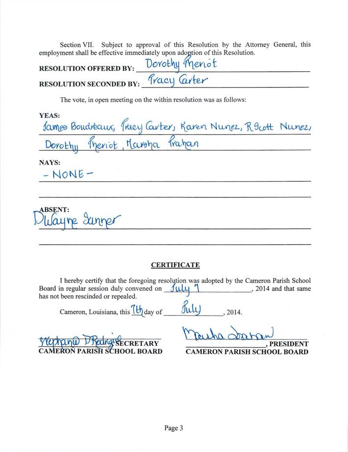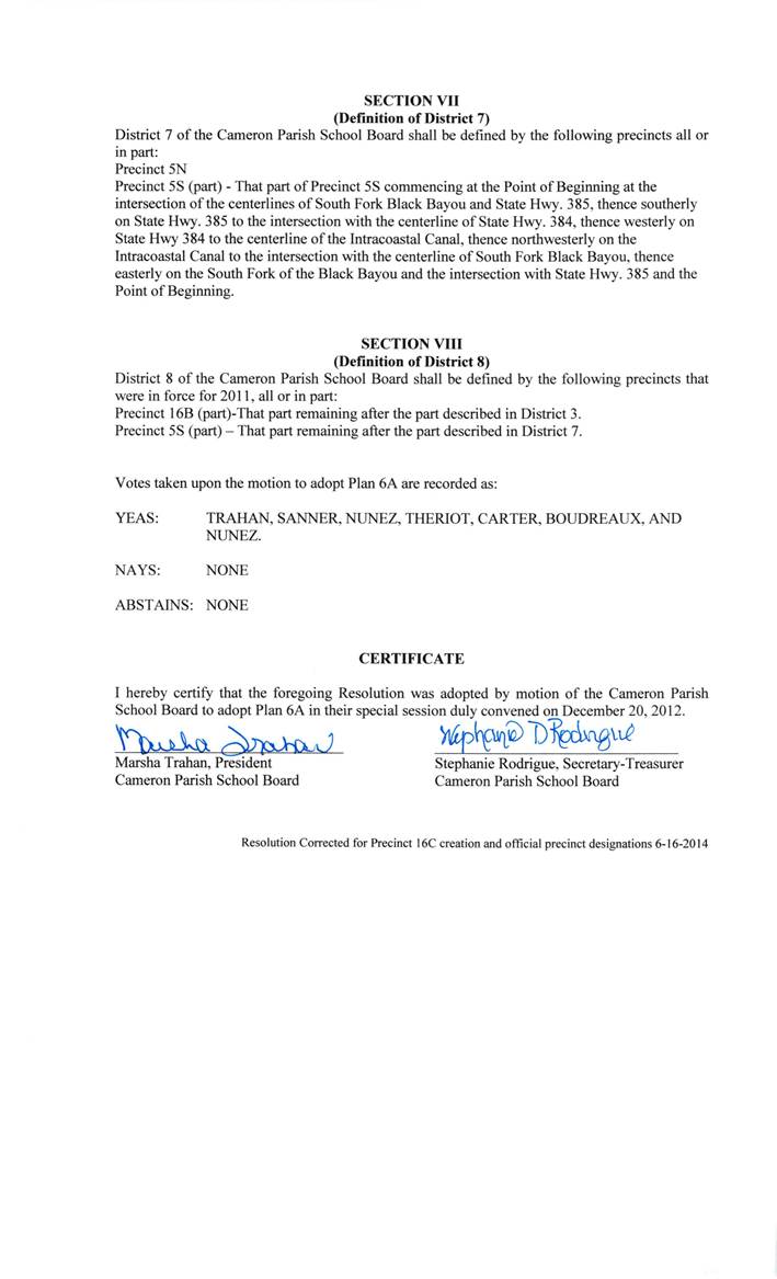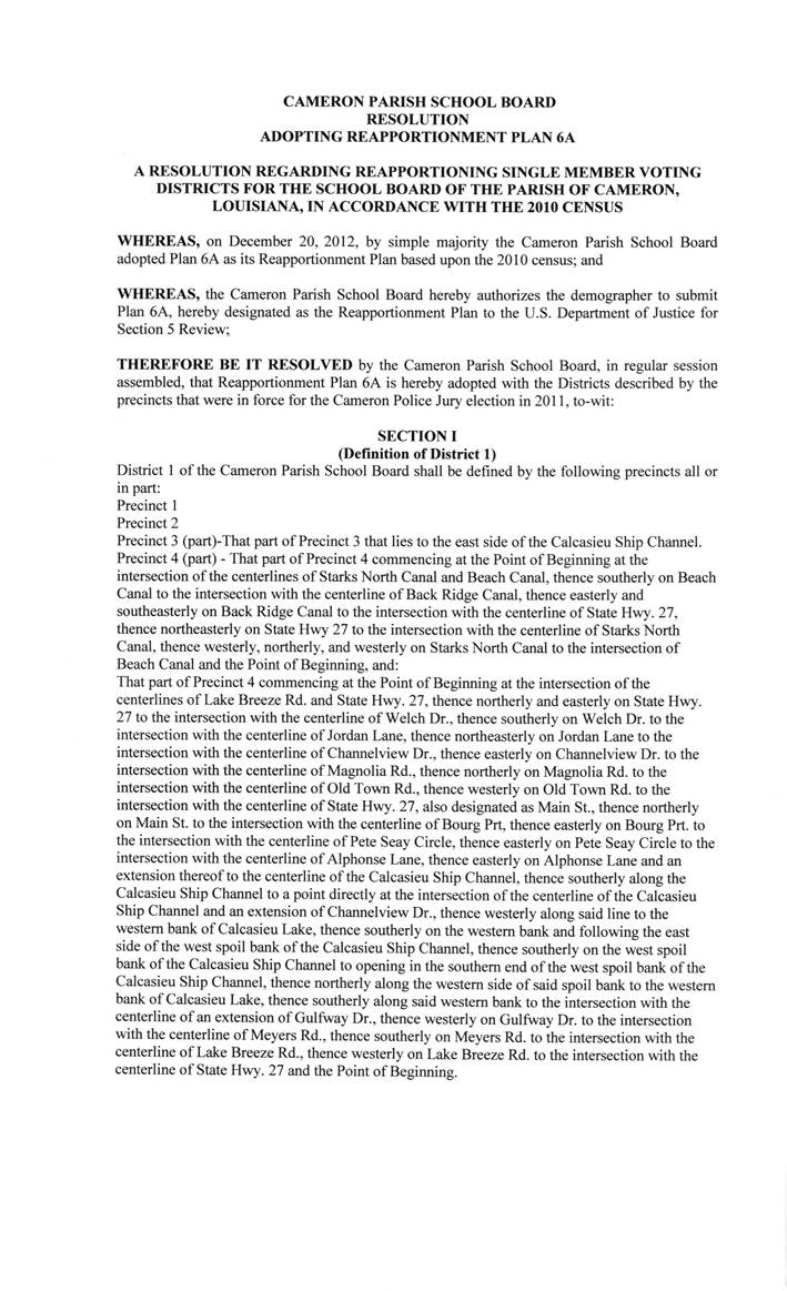 On the motion of Mrs. Nunez, seconded by Mr. Boudreaux, the Board approved updated resolution adopting plan 6A, to include the new district created by the Cameron Parish Police Jury, as the redistricting plan for the Cameron Parish School Board, as prepared by Mr. Mike Hefner, Geographic Planning and Demographic Services and presented by the Superintendent.