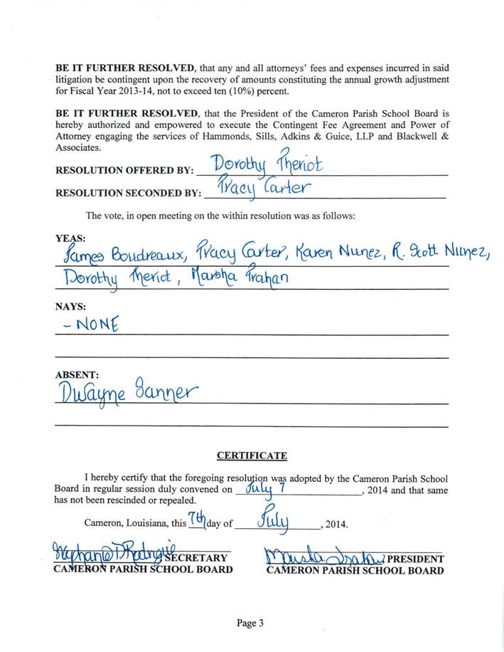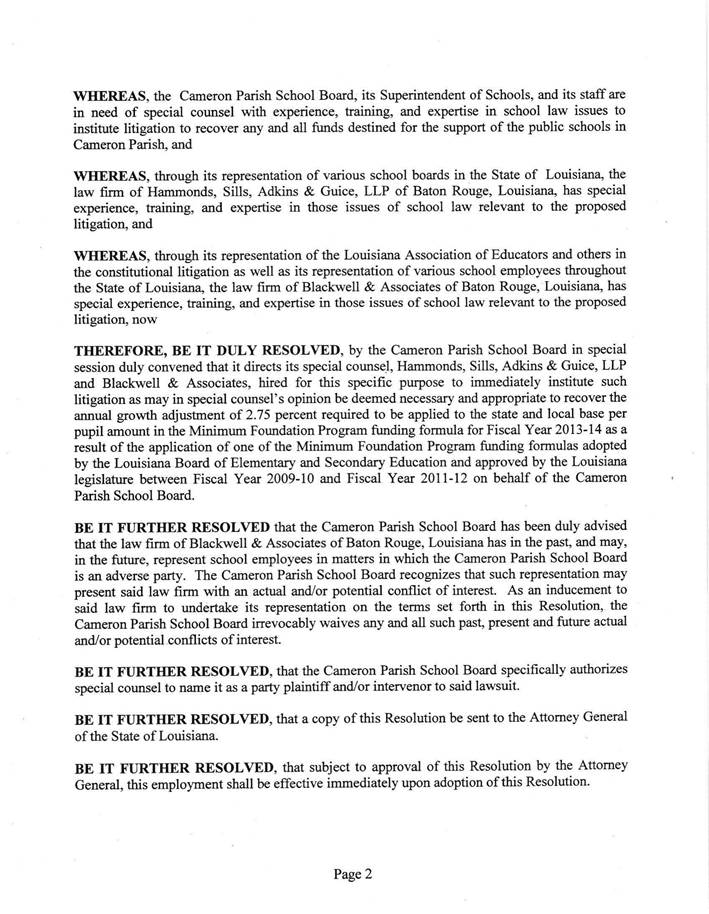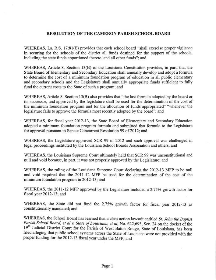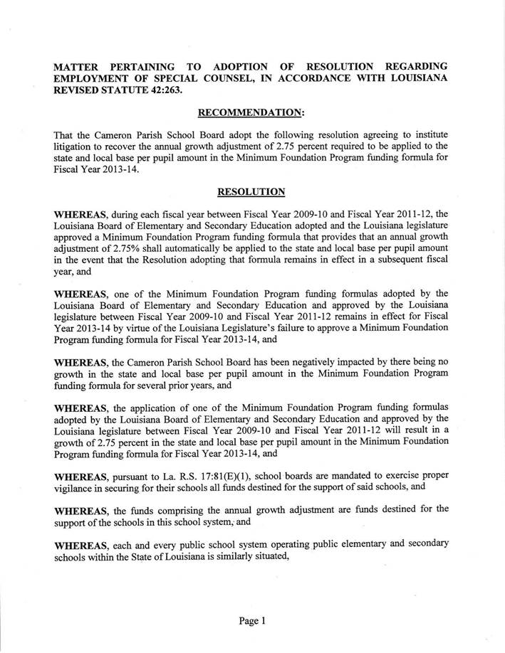 On the motion of Mrs. Theriot, seconded by Mrs. Carter, the Board approved the following resolution in reference to Minimum Foundation Class Program action litigation, as presented by the Superintendent: