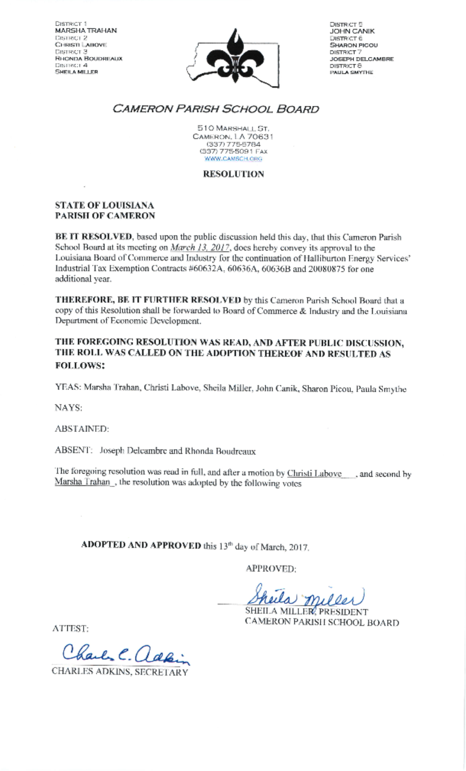On the motion of Mrs. Labove, seconded by Mrs. Trahan the Board approved a resolution supporting the continuation of the existing Industrial Tax Exemption agreement between Haliburton and Cameron Parish, as presented by the Superintendent.