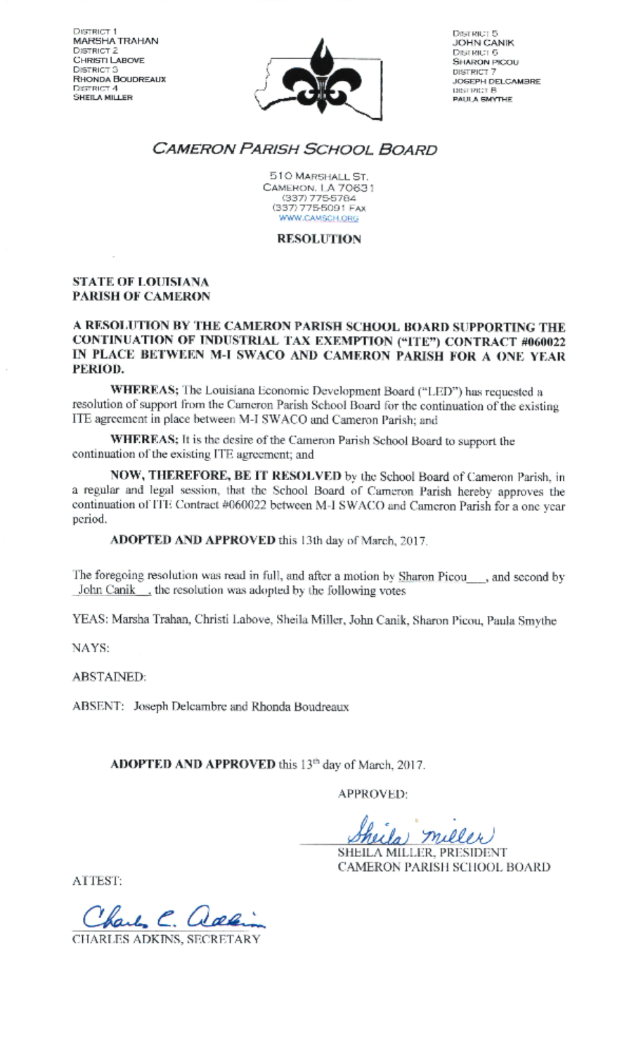 On the motion of Mrs. Picou, seconded by Mr. Canik, the Board approved a resolution supporting the continuation of the existing Industrial Tax Exemption agreement between M-I SWACO and Cameron Parish, as presented by the Superintendent.